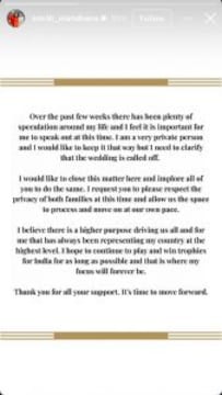 ದೃಢೀಕರಣವು ತನ್ನ Instagram ಸ್ಟೋರಿಯಲ್ಲಿ ಹೇಳಿಕೆಯ ಮೂಲಕ ಬಂದಿದೆ, ಅಲ್ಲಿ ಭಾರತೀಯ ಮಹಿಳಾ ರಾಷ್ಟ್ರೀಯ ಕ್ರಿಕೆಟ್ ತಂಡದ 29 ವರ್ಷದ ಉಪನಾಯಕಿ ವದಂತಿಗಳನ್ನು ನೇರವಾಗಿ ಉದ್ದೇಶಿಸಿ, ಎರಡೂ ಕುಟುಂಬಗಳಿಗೆ ಗೌಪ್ಯತೆಗೆ ಮನವಿ ಮಾಡಿದ್ದಾರೆ.